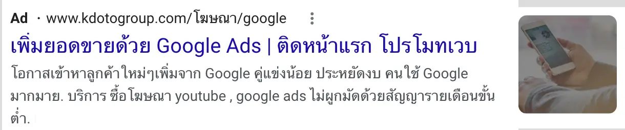 - เพิ่ม Brand Awareness: ทุกครั้งที่โฆษณาของเราปรากฏบนหน้าแสดงผลการค้นหาก็จะเพิ่มการรับรู้แบรนด์และธุรกิจของเราไปในตัว อย่างน้อยเว็บไซต์,บริการของเราก็ได้ปรากฏบนหน้าการค้นหาและผ่านตาของลูกค้า